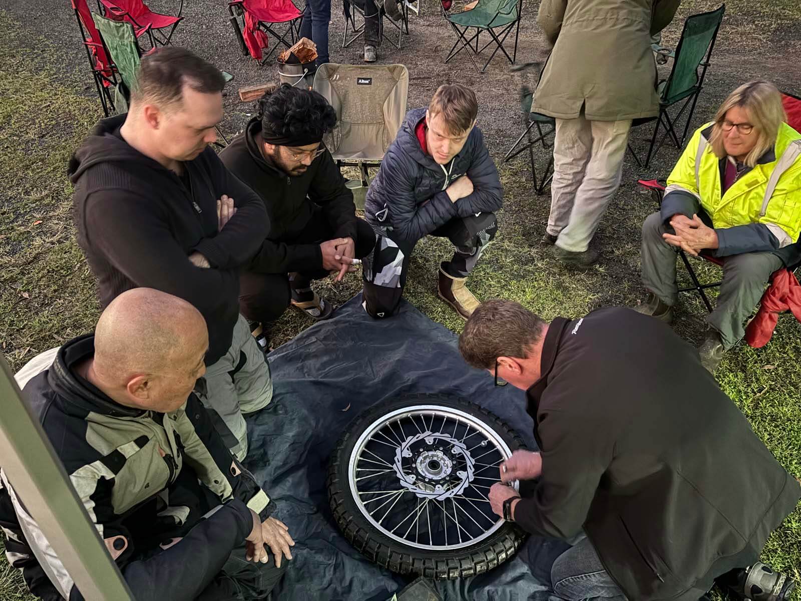 Back at Mangrove Mountain there are camping spots available and around the camp-fire that evening Mick demonstrates tyre changing as Abbey and Liz fire up the BBQ.