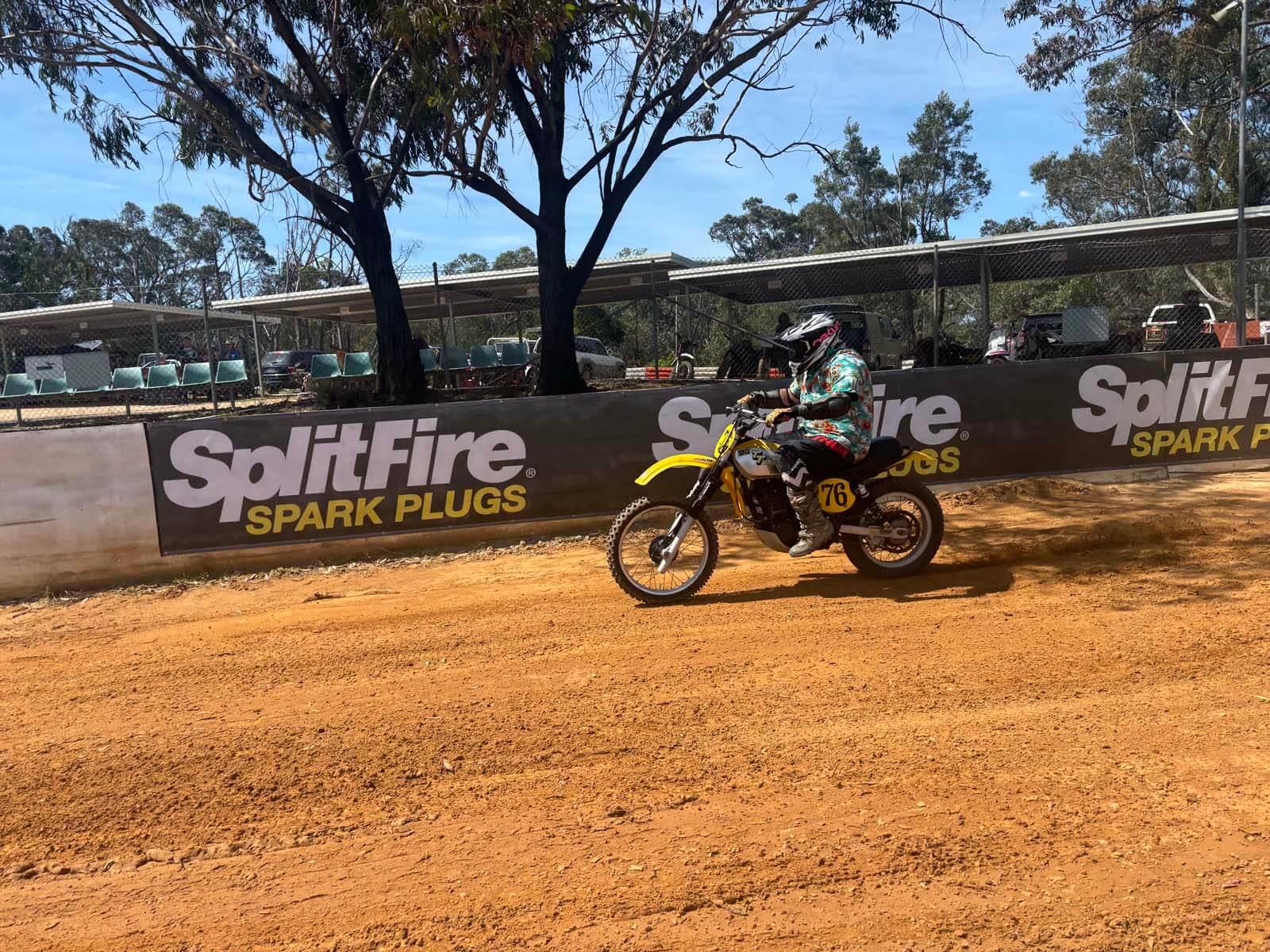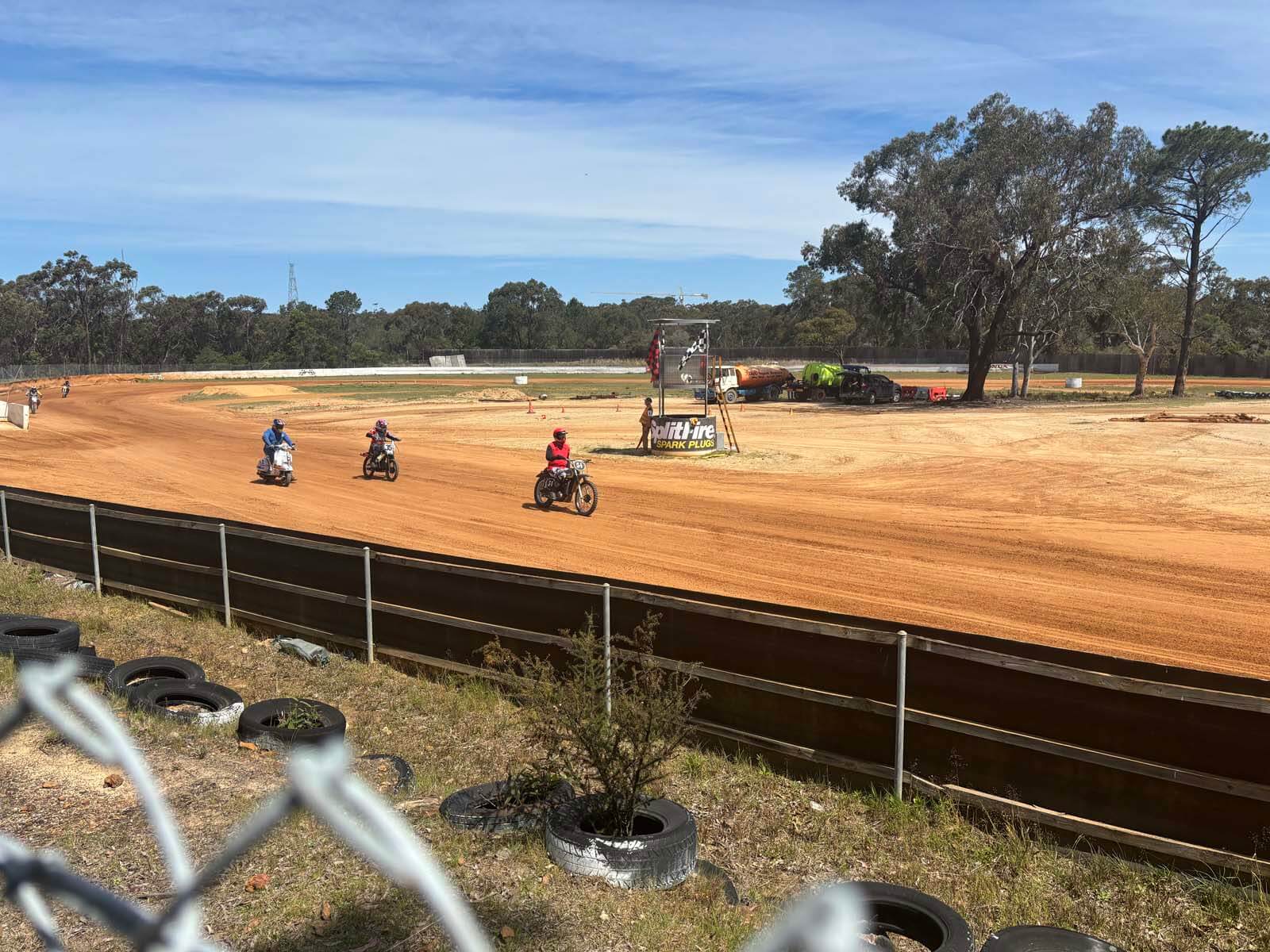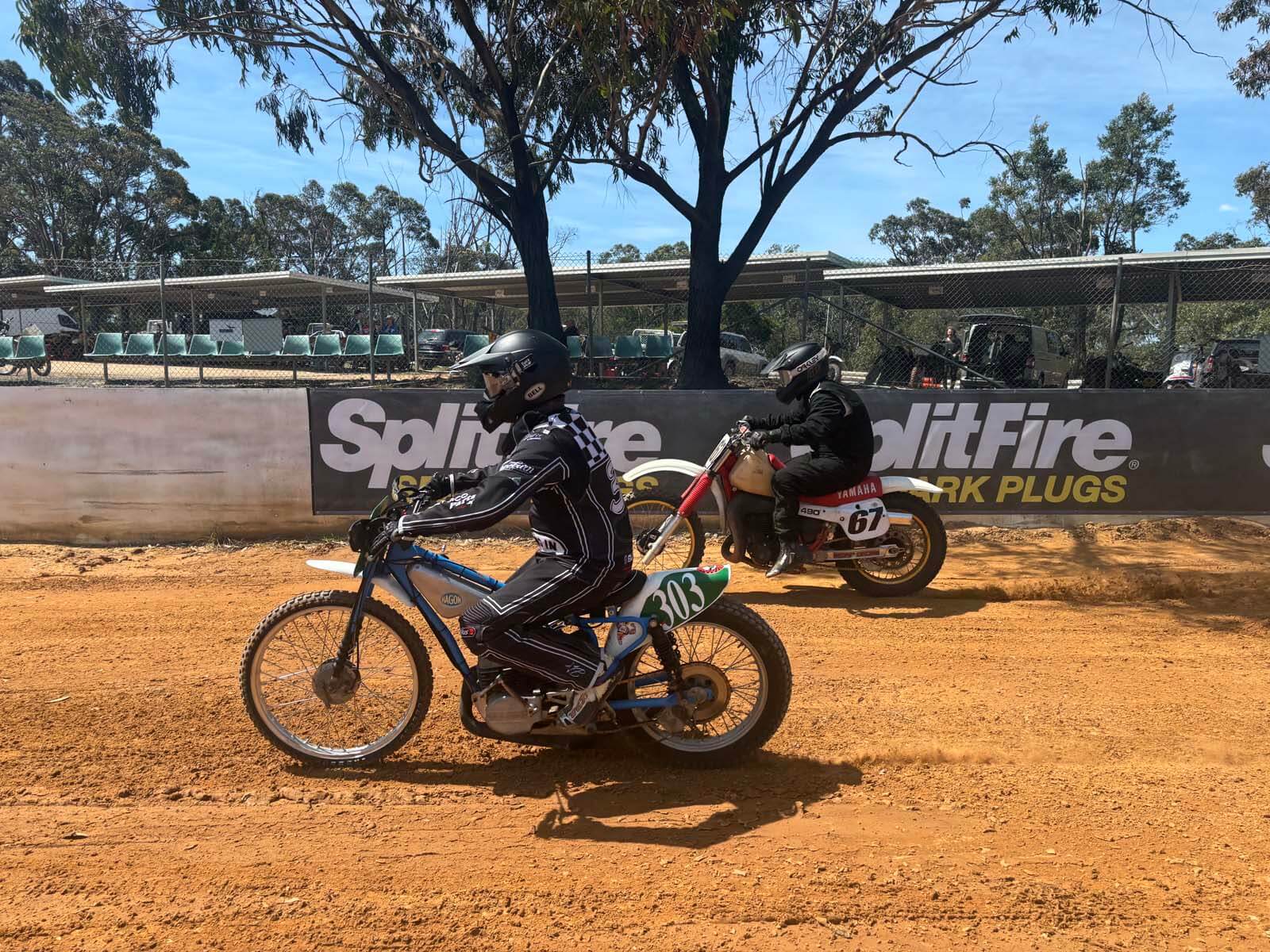 Sean's first race at Nepean dirt track in Western Sydney ended in a long walk back to the pits. The oversized 34mm carby did not want to deliver the right mix to the old chook chaser. And then the coil failed to provide a spark. Fortunately for Sean, the vintage dirt track community – aka the Jerkyls - gathered round, donated an emergency coil and Sean managed to ride a few laps. Slowly.