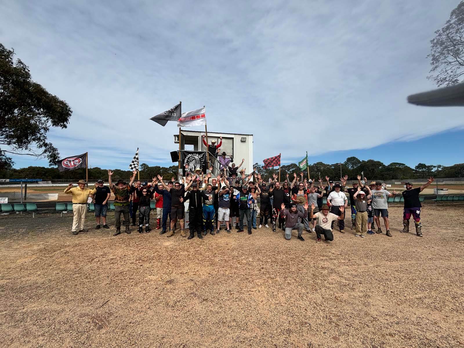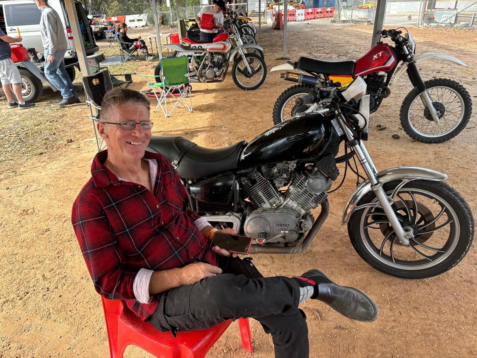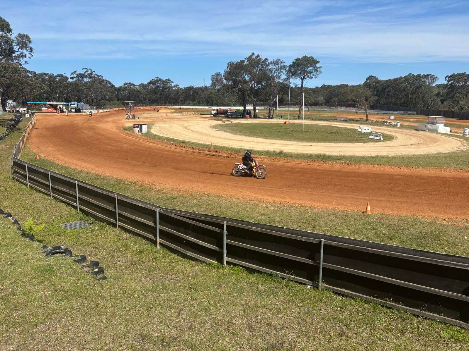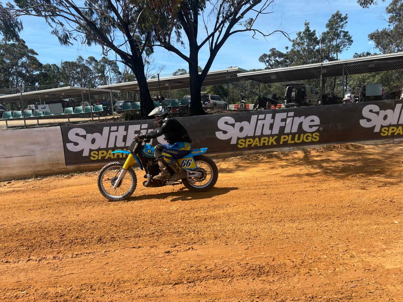 Sean's first race at Nepean dirt track in Western Sydney ended in a long walk back to the pits. The oversized 34mm carby did not want to deliver the right mix to the old chook chaser. And then the coil failed to provide a spark. Fortunately for Sean, the vintage dirt track community – aka the Jerkyls - gathered round, donated an emergency coil and Sean managed to ride a few laps. Slowly.