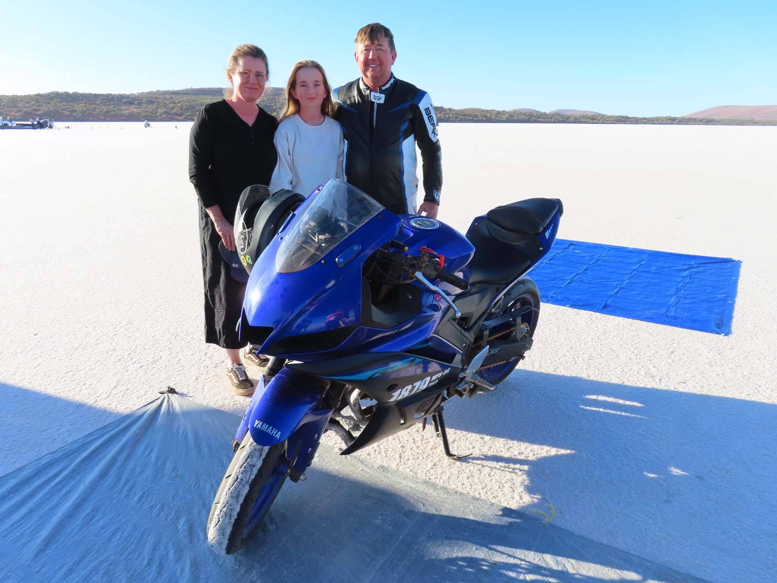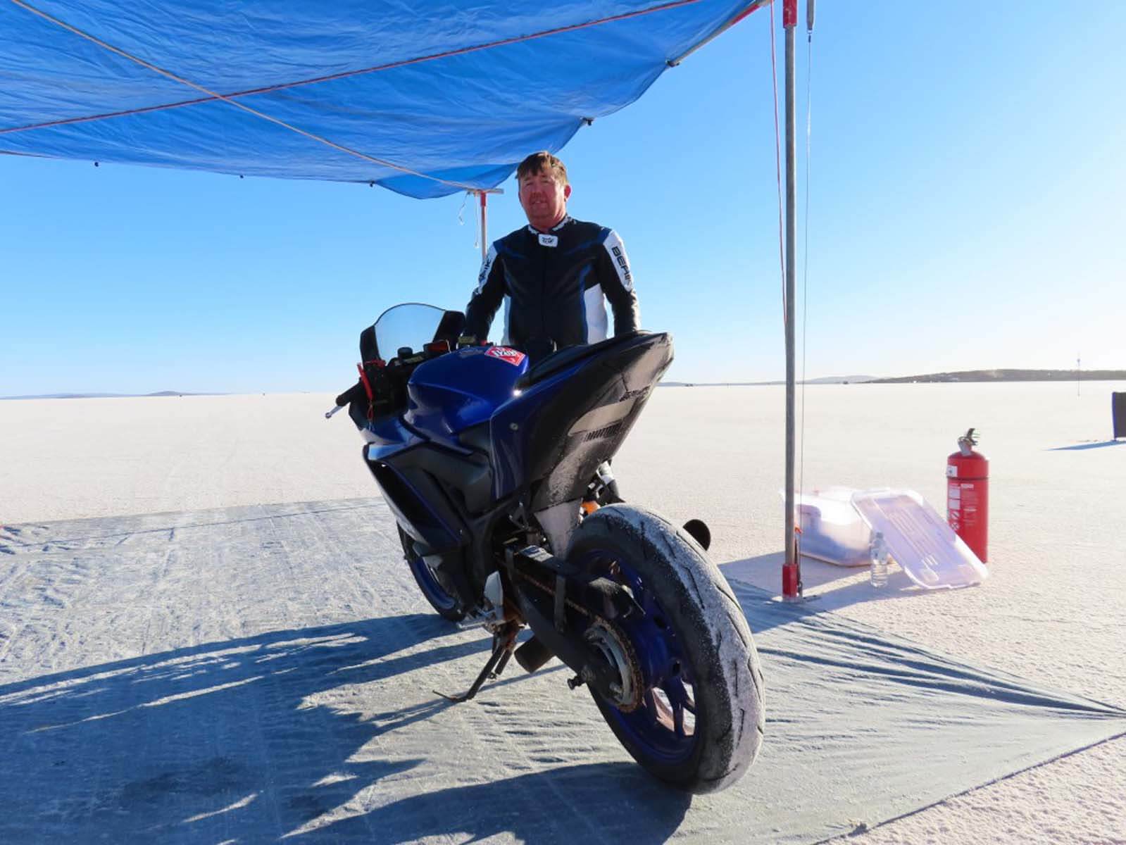 The week flew by! (Pun intended) The conditions were intense, with temperatures nearing 40°C each day, but my team—Nell (my wife) and Sarah (my daughter)—worked tirelessly to bring this project to the finish line. Despite many challenges along the way, we achieved our goal and set a record with our turbocharged Yamaha YZF-R3. We now hold the Australian land speed record in the 350cc Modified Partial Streamlined Blown Gas (MPS-BG) class at 111.45mph (179.36km/h). We were among the few who successfully set a record this year, not bad for our first visit to the salt.