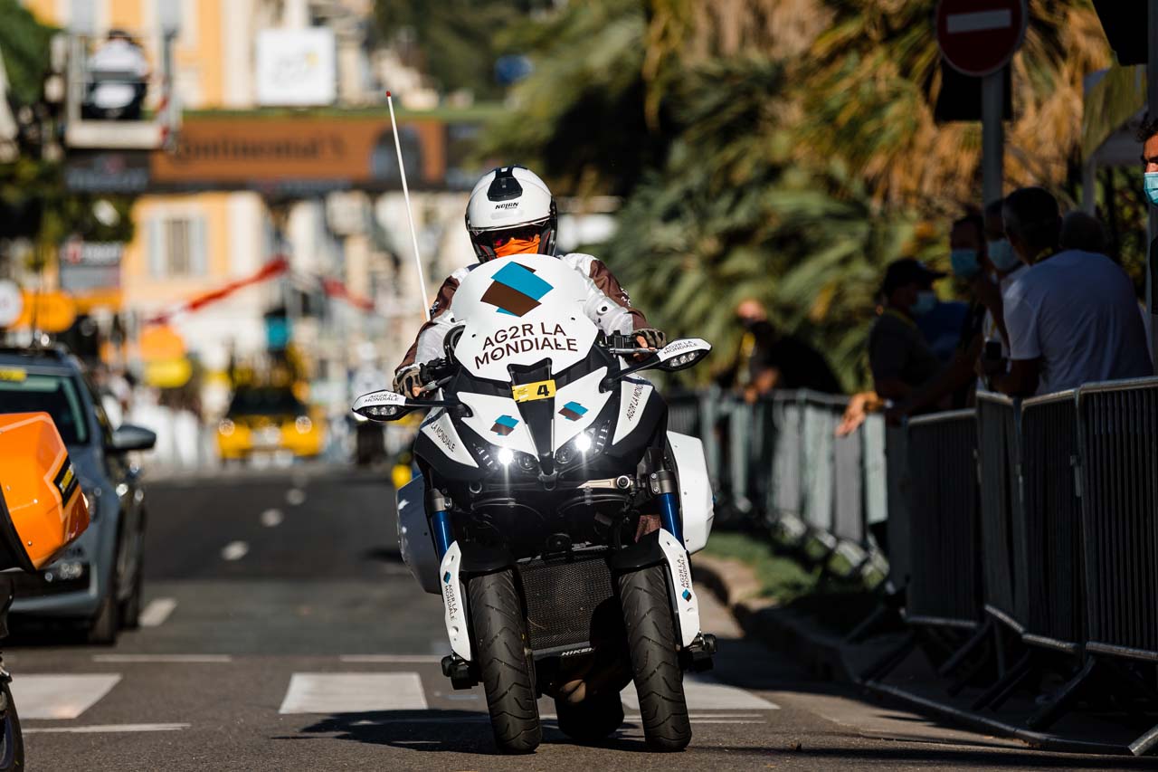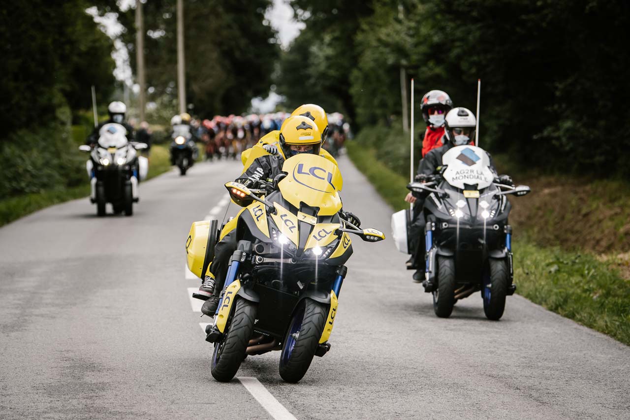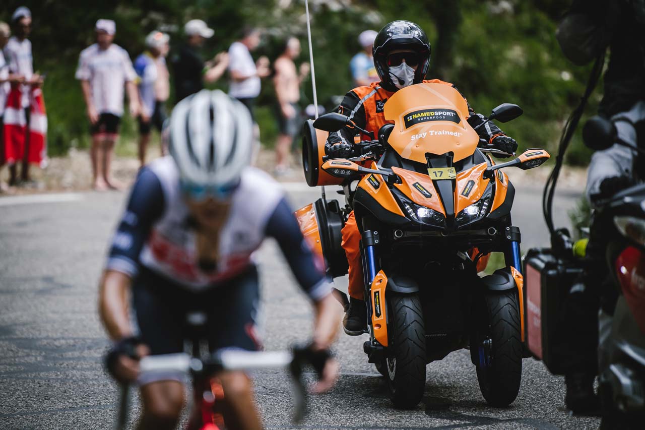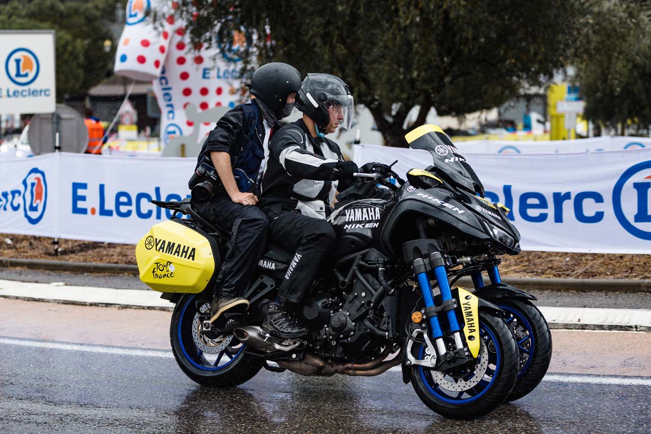 The goal of the Yamaha-mounted riders is to get as close to the action as possible without impacting the race - it does not always go to plan. Medical assistance, communication, mechanics, and race coordination are all motorcycle-mounted, jockeying for the best position as the peloton roars along at 50-70km/h.