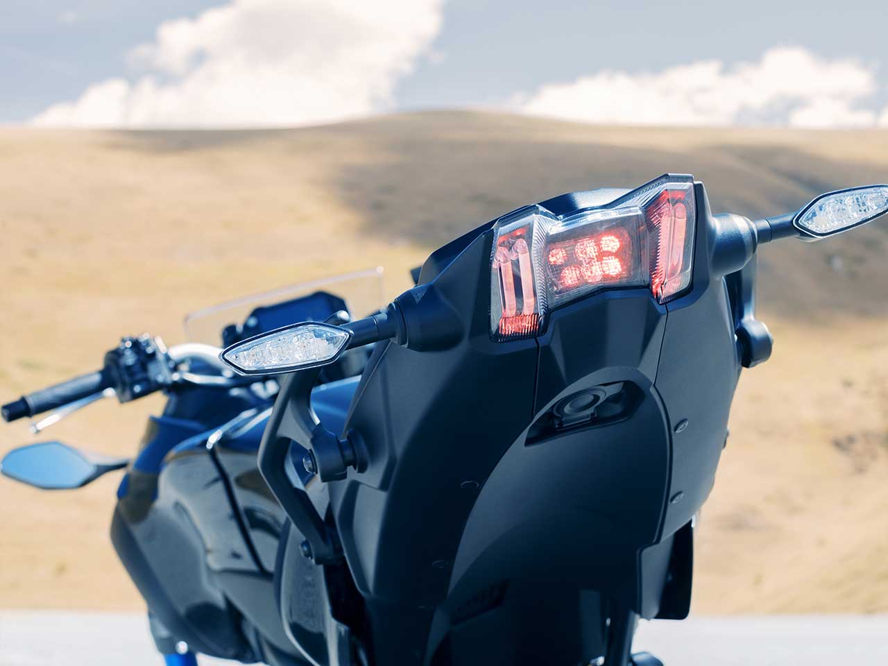 The body design makes full use of the unprecedented front-end suspension mechanisms pairing 15-inch front wheels with dual-tube upside-down forks to visually accentuate the machine's sporty performance and create a high-quality look and feel at the same time.