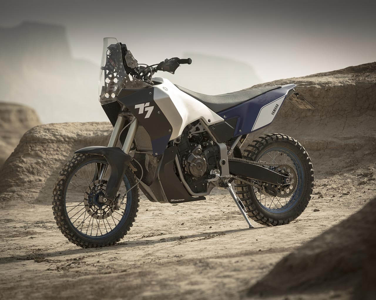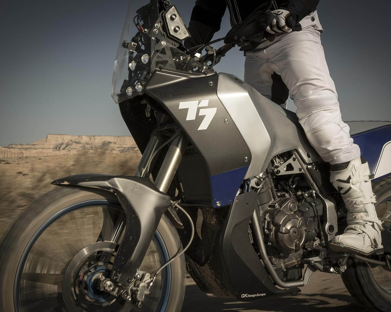 A committed team composed of Yamaha's engineers, designers and product planners from the Official Rally Team in France, the R&D in Italy and GK Design in the Netherlands have developed the new T7 concept. Each member of the team is driven by a desire to create something that would fit the needs of the adventure traveller and represent the Yamaha vision for the next generation of adventure bikes.