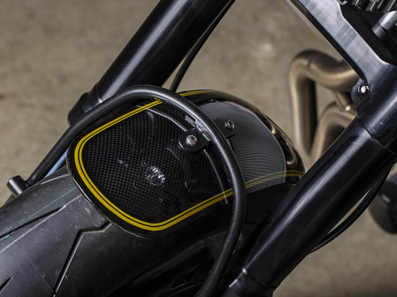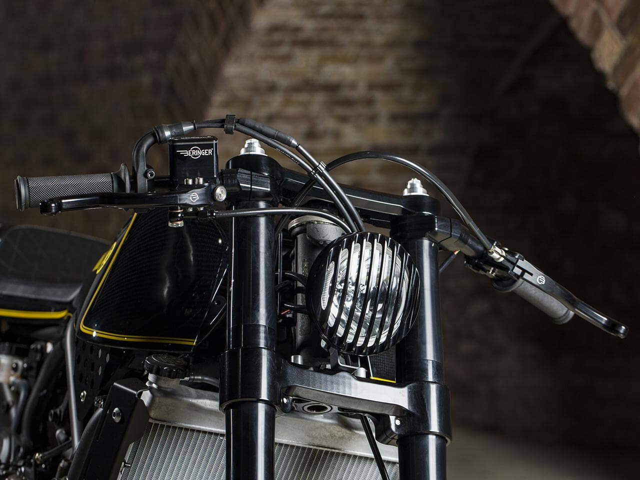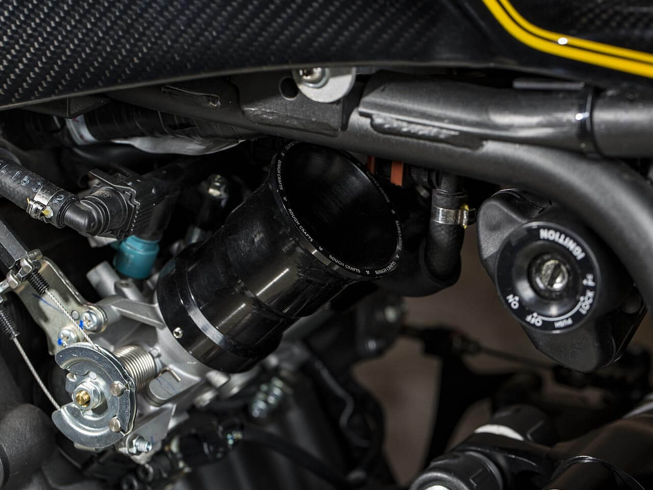 The detail on the Corsa Scorcher café racer is outstanding, with a Rough Crafts custom header on the exhaust. The rear brake calliper is standard XSR with a Beringer disc set up. A Wukawa Industry sprocket runs the rear, with Gilles Tooling rear sets and MS Pro foot pegs. MS Pro controls keep everything on point on the bars, next to Rough Crafts custom grips and Rough Crafts custom Fin Style Risers. There's more signature in-house work with the Rough Crafts Grill type headlight, fuel cap and of course the carbon body unit. Last, but not least, Rough Crafts velocity stacks set off the motor itself.