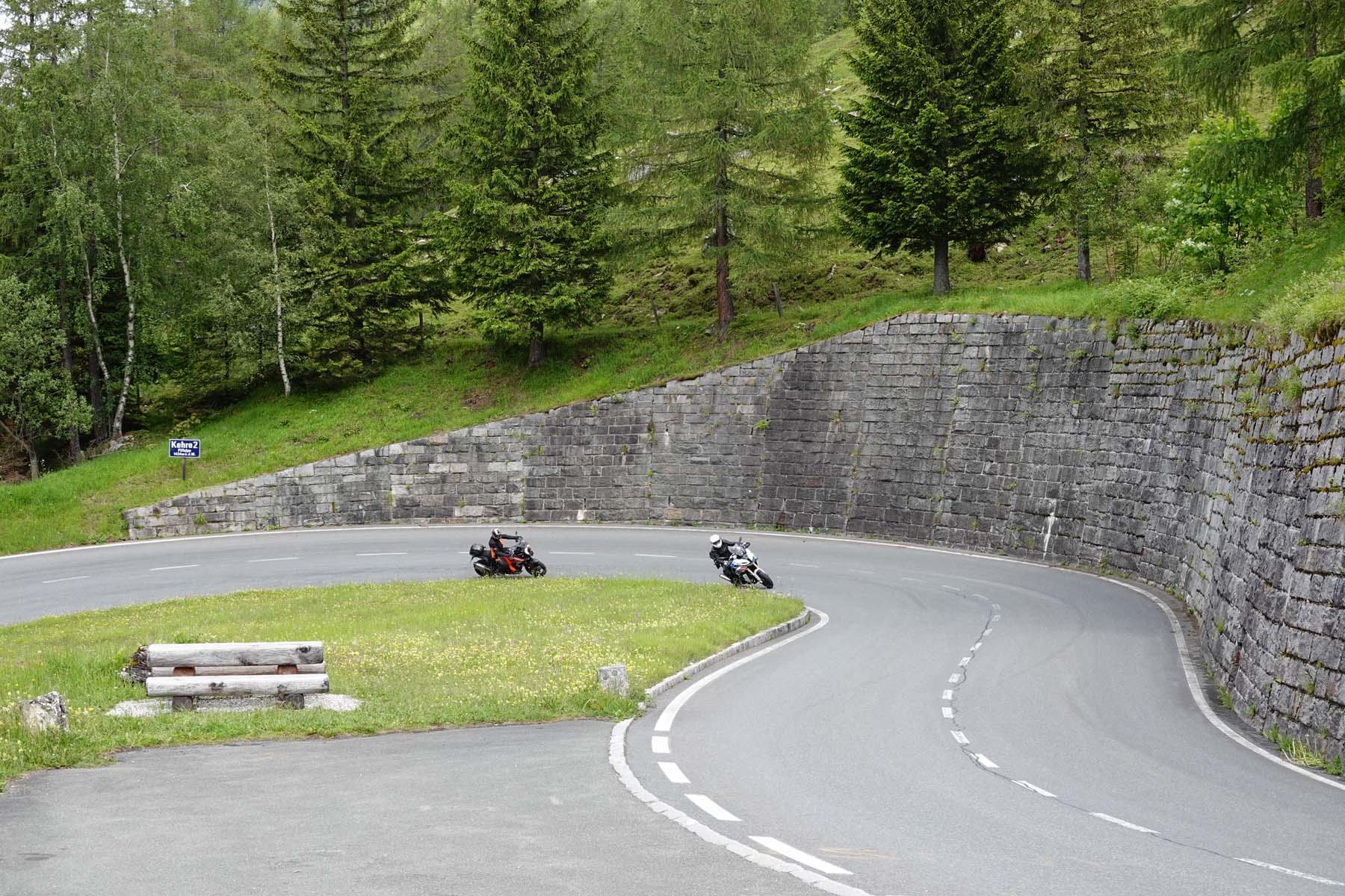 Your 33km for 33 Euros starts at the toll point near Fusch, and despite the warning to keep your speed down, it becomes competitive very quickly on the way up to the Edelweiss-Spitze, the highest point accessible by road. A section of its parking area is dedicated to motorcycles; this is not the only place along here where we get special treatment. While this section of the road is highly enjoyable, the run onwards to Schoeneck is even more exciting. It’s important to remember, though, that despite everything it offers us, this is not a dedicated bike road. It’s a tourist road, built as such in the 1930s, with all the limitations like cars stopped in corners to allow their passengers to take photos or find parking to sample the other attractions.