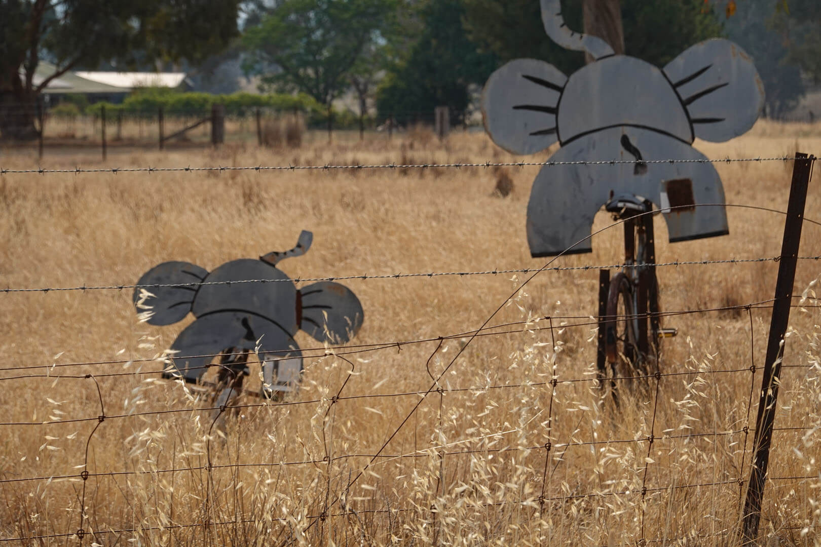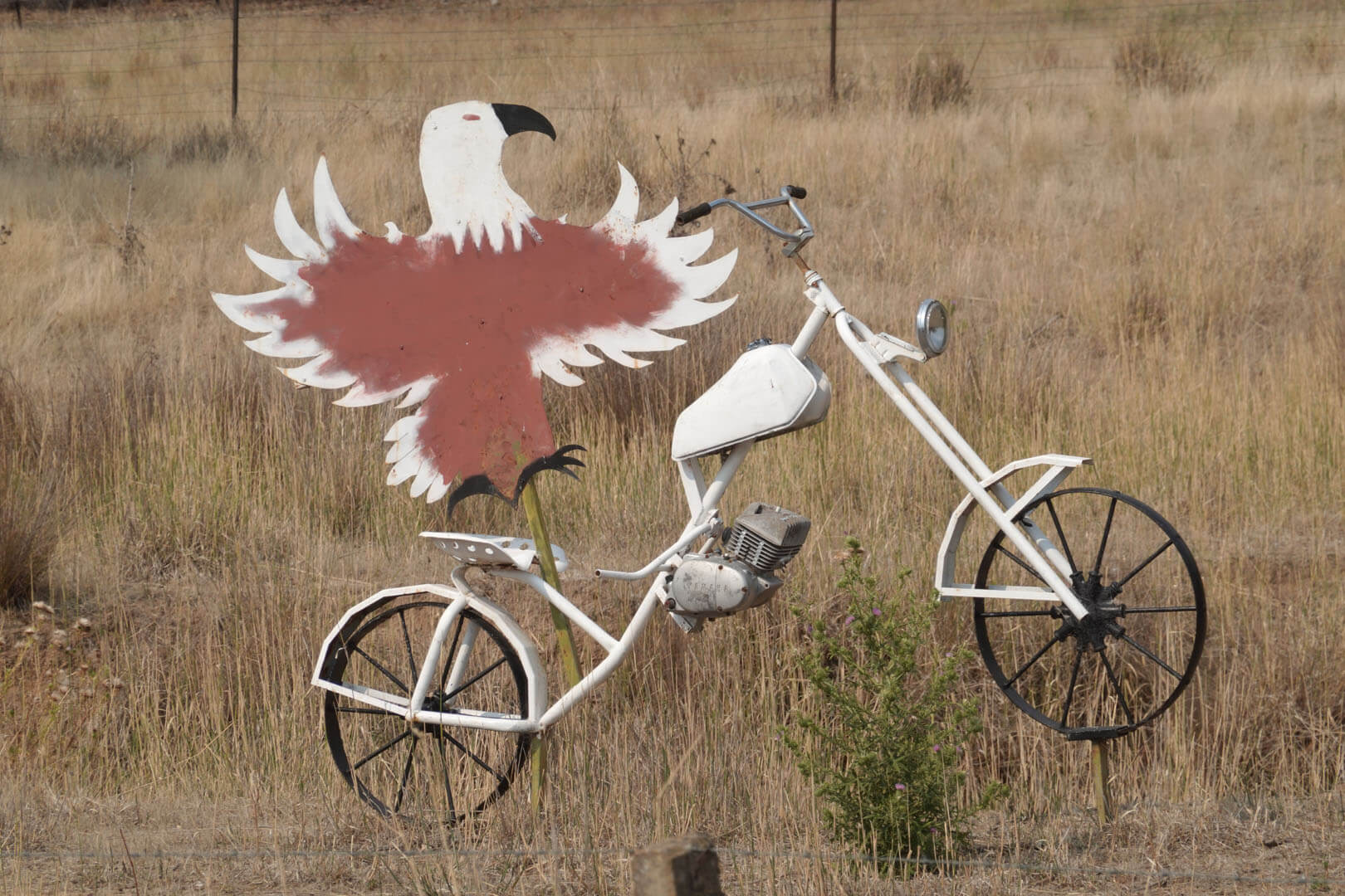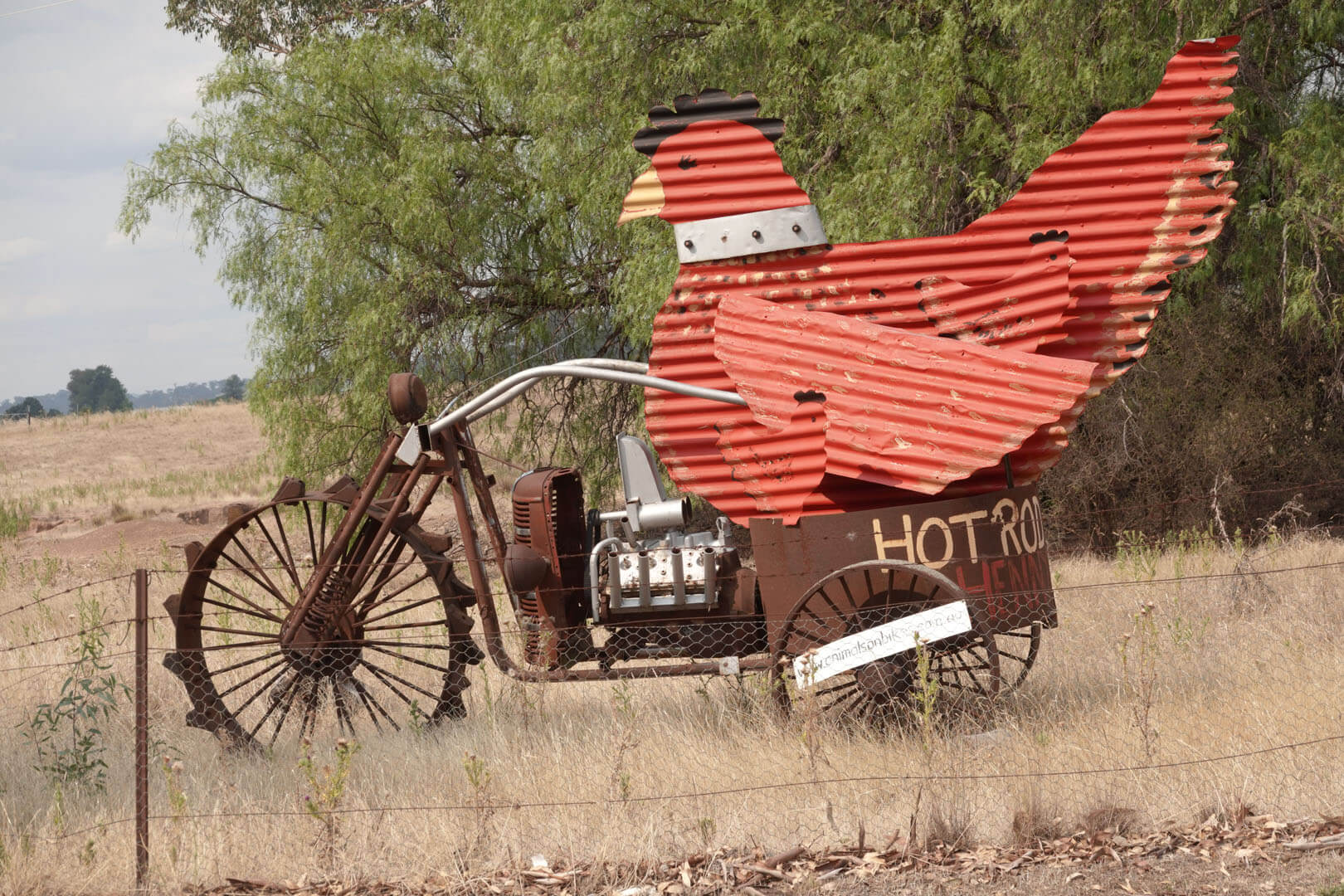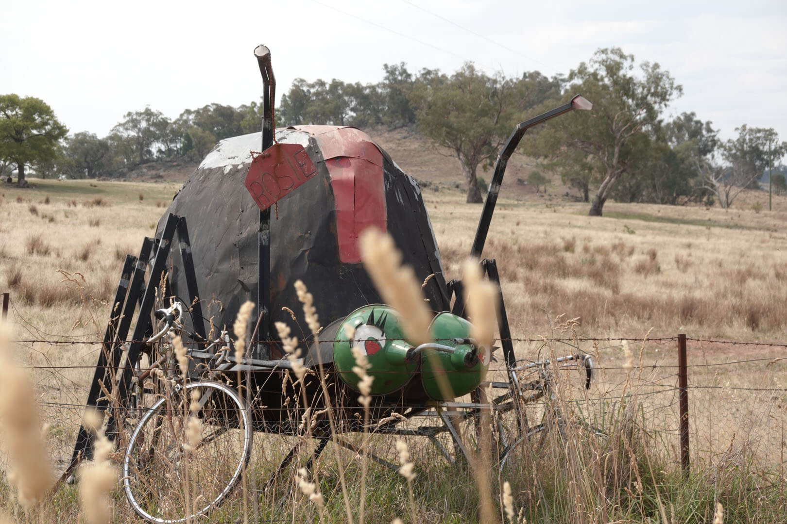 Country folk are remarkable. I travelled halfway around the world with my mate Charlie, who comes from Big Jack’s Creek near Willow Tree above the Hunter, in New South Wales. Charlie is a very good example of the “Number 8 Wire Mechanic”, the bloke who can fix just about anything with a length of rusty, abandoned fencing wire. Out in the Central Western Slopes and Plains, they’ve taken that one step further. They’ve lined their paddocks with animals made from the equivalent of No. 8 wire, and not just animals but animals riding their preferred form of transport as well. These animals along the Obley Road out in the Orana are almost all… on bikes.