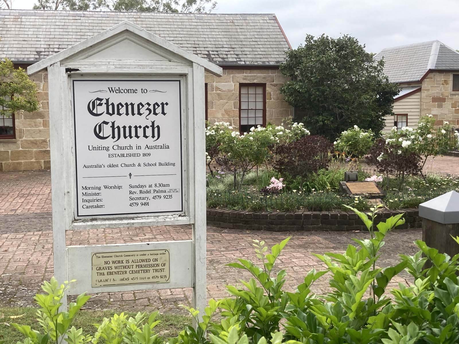 If you’re coming from the southern suburbs, make your way to Elizabeth Drive and follow that past the site of the new airport to Wilmington Road and then Park Road. That gets you to Wallacia where you’ll pick up Mulgoa Road north to Penrith. Continue along Castlereagh Road to Richmond, then to Windsor and finally across the new bridge on Wilberforce Road. In Wilberforce, take a right into King Road which becomes Sackville Road. Five kilometres later you’ll come to the sign to Ebenezer Church on the right.