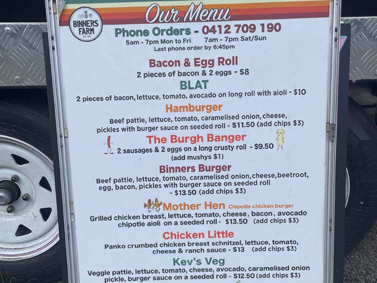 The Binners Farm Food Truck is open seven days per week from 7am until 7pm.